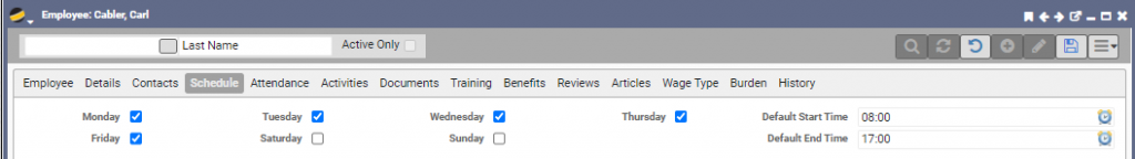 An employee is given a Default Start Time of 08:00 and a Default End Time of 17:00 for a total of 9 hours.