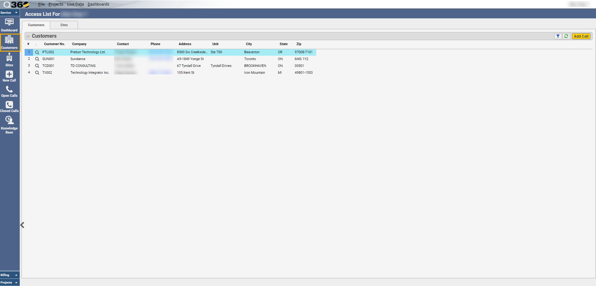 - Add a Call – specific to the highlighted Customer