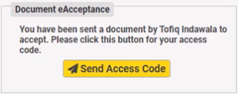 - When the recipient clicks on the link, a “Document eAcceptance”, a pop up appears with message: “You have been sent a document by [name of requestor] to accept. Please click this [Send Access Code] button for your access code”