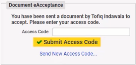 eAcceptance prompt: Send Access Code - When recipient clicks on the “Send Access Code” button, a pop up appears with message: “You have been sent a document by [name of requestor] to accept. Please enter your access code”