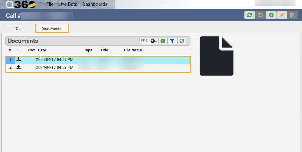 - DOCUMENT (view) – allows user to see the Documents tab on a call and the grid contents according to the public flag / user type (see below)