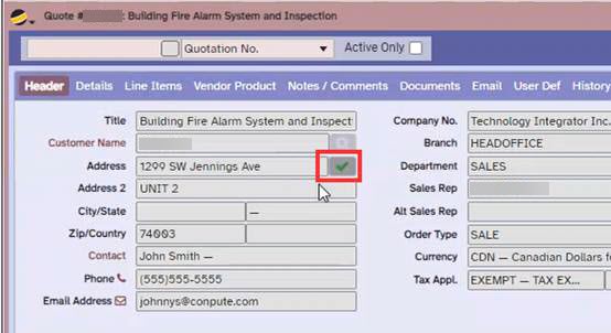 Addresses may now be validated through the configured Address APIs for Canadian and US addresses. Various forms (see below) will have a button with a check icon next to the addresses allowing them to be validated. After validating the address, the user can decide whether or not to use the suggested address. Modifications can still be made to suggested addresses or the updated addresses can be modified and re-validated.