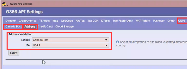 - Configure the Address Validation on the Address tab – select the integration to use for Canada and USA from the drop down menus