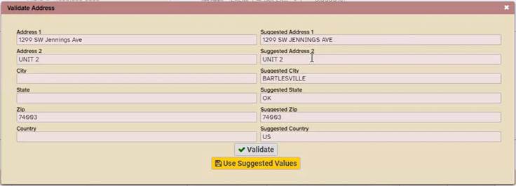 Clicking the checkbox will open a Validate Address window displaying the Current and a Suggested address