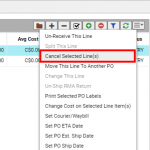 - Select the manual line item on PO 2 that was added in Step 1 above. Use the extended menu option Cancel Selected Line(s) to remove the item from the PO. Since this item was not linked to an order, the item is cancelled and does not show up in the Purchasing Q.