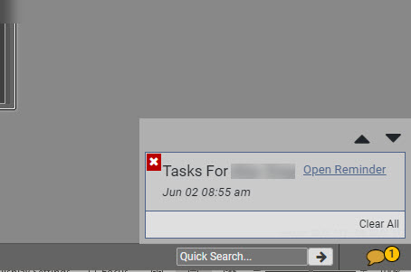 - Reminders will appear in grid format, along with background job notifications and user maintenance items. Note: this grid may be filtered and / or customized.