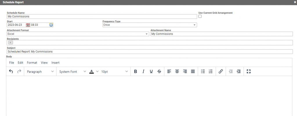 - “Use Current Grid Arrangement” checkbox: when checked, the exported attachment’s column order and hidden columns will match the current state of the grid at the time of scheduling. When unchecked, these will match the default formatting of the live data report