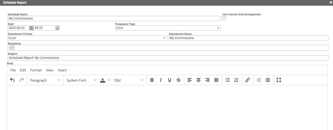 - “Use Current Grid Arrangement” checkbox: when checked, the exported attachment’s column order and hidden columns will match the current state of the grid at the time of scheduling. When unchecked, these will match the default formatting of the live data report