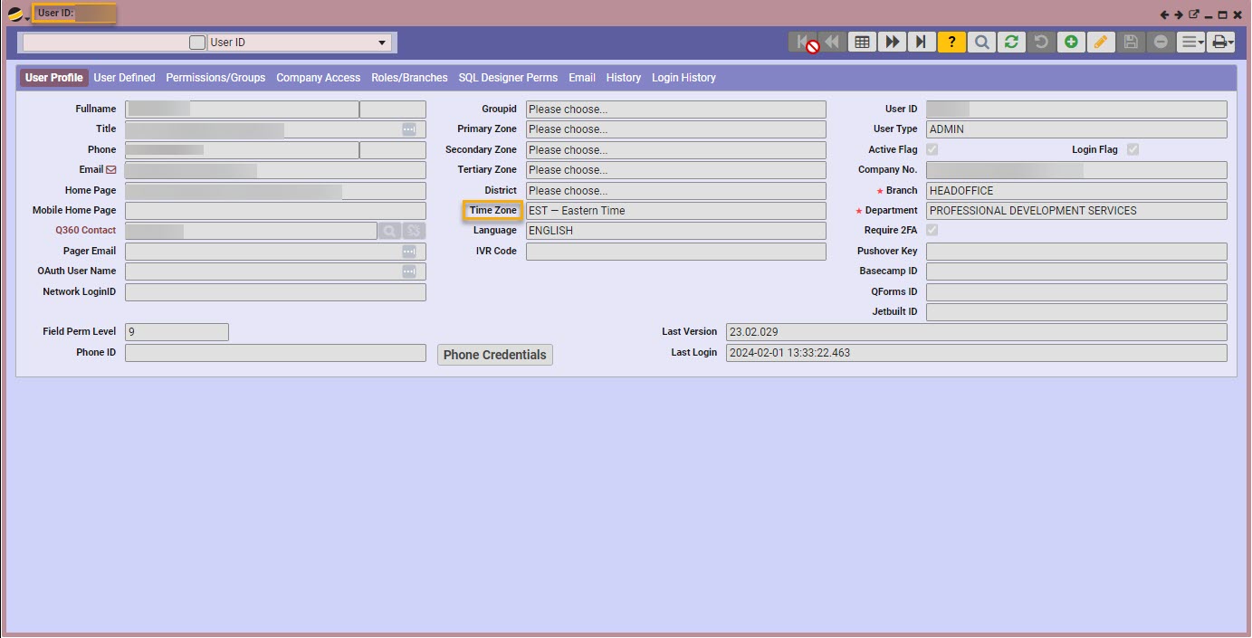- Users may also set their own time zone using the User Preferences (top right of Q360 window) > Time Zone field (select from drop down list). This action will update the UserID record