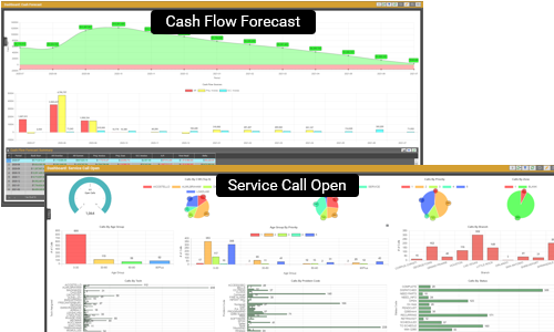 List includes dashboard for: Executive, Sales (4), Project, Service (2), Purchasing, HR, Employee Utilization (3), Cash (2), Accounts Receivable, Revenue