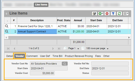 Option to link vendor information to a Service Contract line item: vendor name, vendor reference no, date range being covered, vendor cost, status of coverage. Allows you to track vendor maintenance contract details, and initiate PO when time comes for renewal, from the new Vendor Service Contract Renewal Q.